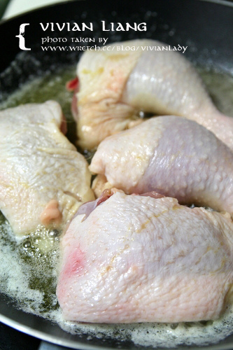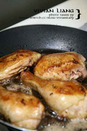 雞肉朝下,雞皮朝上。中火煎二分鐘,翻面。重覆翻面二次,起鍋,旁邊等。