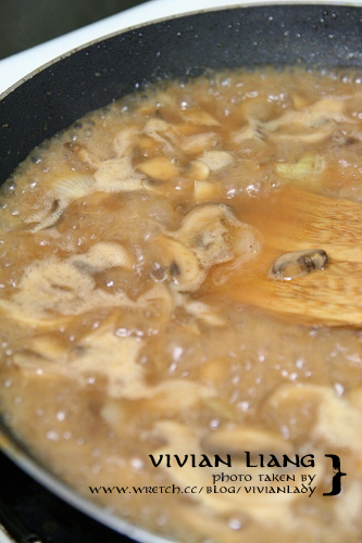 原鍋,炒洋蔥至軟後,加入蘑菇翻炒約三分鐘,加入麵粉1 tablespoon翻炒至糊。