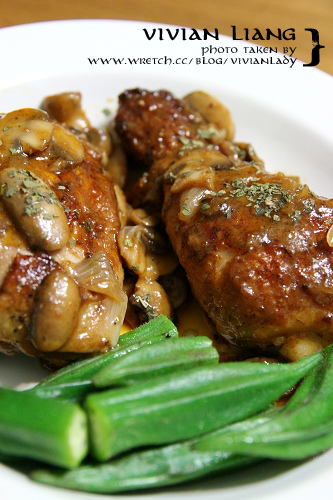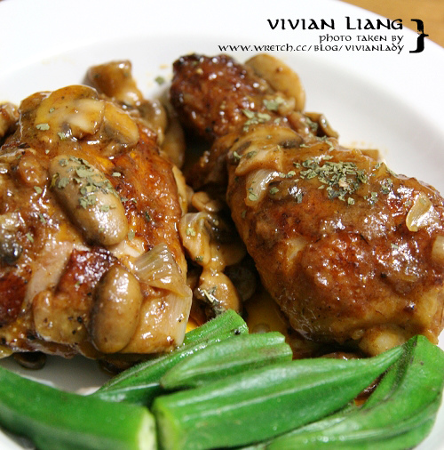 在網路上找食譜的時後,最怕萬中選一覓來得食譜碰到得要東奔西跑買食材、買香料的…麻煩,尤其是西餐,所以最後選定的食譜,往往是以家裡冰箱打開就有的食材為主,要不就自以為聰明的以手邊就有的材料代替。像這道照著食譜料理了好幾次的「法式蘑菇燉雞肉」,就曾經因為家裡附近的超市買不到食譜上的迷你洋蔥(珍珠洋蔥)所以便以家裡就有的一般台灣洋蔥取代,還有假日的時後跑了幾趟百貨公司樓下的超市至今還沒買到的龍蒿 tarrangon…。