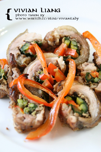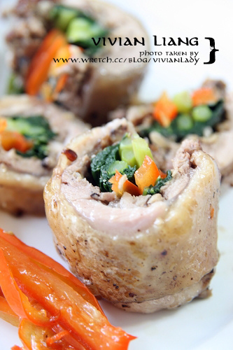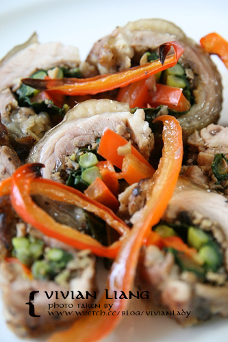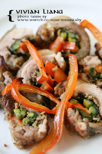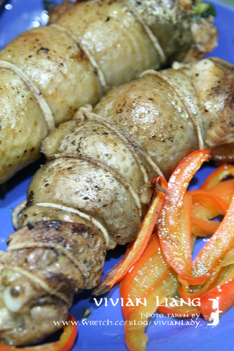 第一次做雞捲,有點小小的失敗,味道非常的美味,只是雞捲捲的不夠扎實,切片的時候內餡的蔬菜有點散開來了。