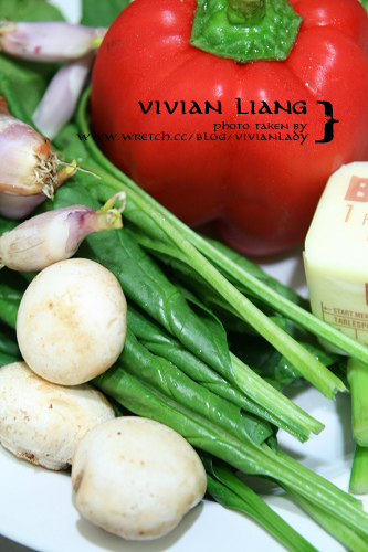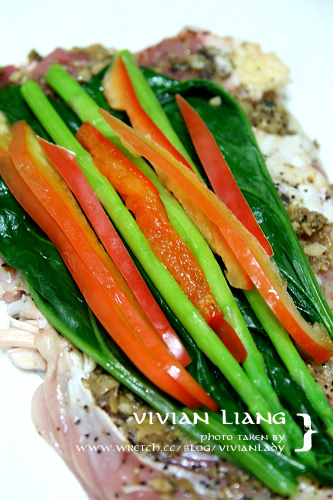 雞腿肉第一層舖上炒蘑菇,第二層上汆燙擠乾水分後的菠菜葉,第三層鋪上烤甜椒絲。最後放上蘆筍。(用來汆燙菠菜和蘆筍的滾水中放少許的鹽,有調味及保持綠色的作用。