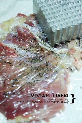 灑上鹽和黑胡椒調味。用保鮮膜將雞腿肉微微包好,將雞肉均勻拍打成1/2吋的厚度。