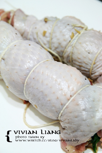 ↑將雞腿捲起,在兩頭用綁肉棉線分別綁緊防止散開。