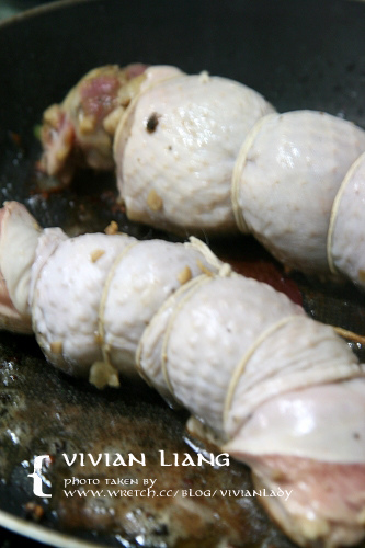 ↑在高溫的平底鍋內加入少許油,先把雞捲封口處煎香定型,然後翻轉。最後將雞捲放入烤盤入烤箱180度烤約20分鐘。