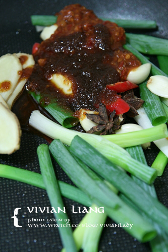 ↑加入湯頭料(蔥、大蒜、辣椒、薑)和調味料(豆瓣醬、沙茶醬)拌炒出香味。