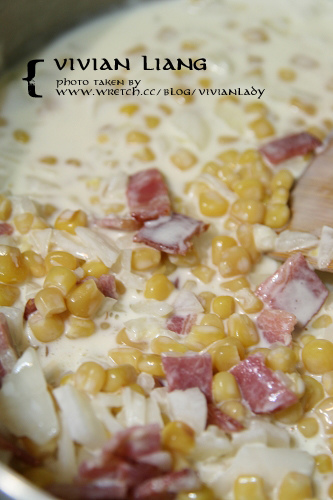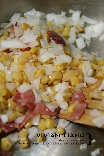 ↑ 鍋內倒入油加熱,放入培根片炒香,加入玉米粒及洋蔥碎拌炒。