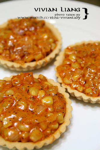 將煮好的餡料倒入烤半熟的派皮中(或已烤好塑好形的塔皮),表面再撒入剩餘70g的起司絲,送入已預熱的烤箱200度,烤約3~5限至起司絲完全融化,上色金黃即可取出。