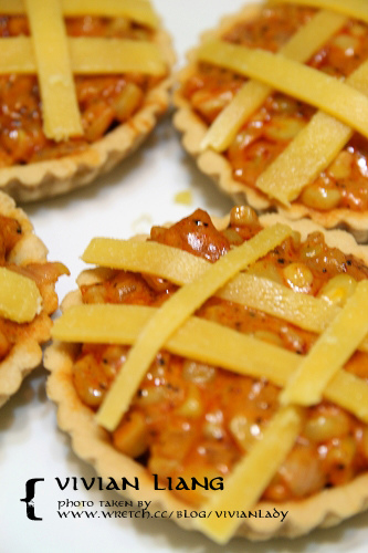 ↑ 將煮好的餡料倒入烤半熟的派皮中(或已烤好塑好形的塔皮),表面再撒入剩餘70g的起司絲。