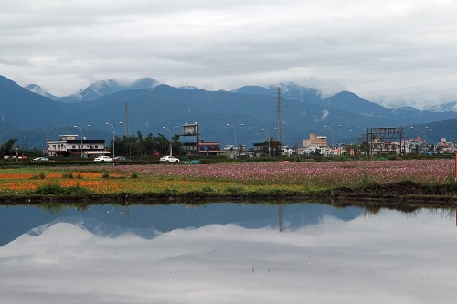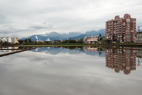 還是好愛宜蘭!!路邊原本一片片綠油油的稻田收了割,注入水,頓時變成一面面的明鏡平躺在地面上呼應著天空。田邊的建築,綠樹,空中飛過的鳥,遠山,呼嘯而過的車,雲靄…活脫脫地在水田上又複製了一次。我彷彿看見了二個一樣的世界,就這麼靜默地上下對立著,這景緻真是魔幻極了。